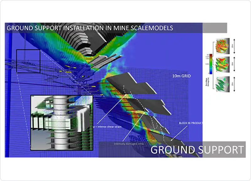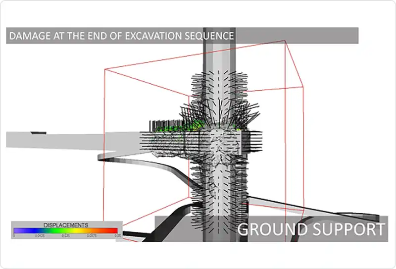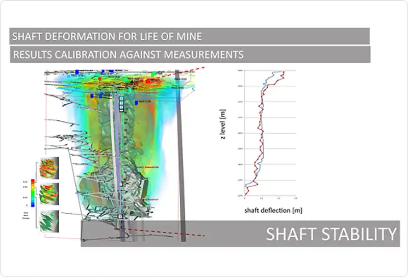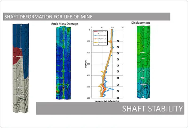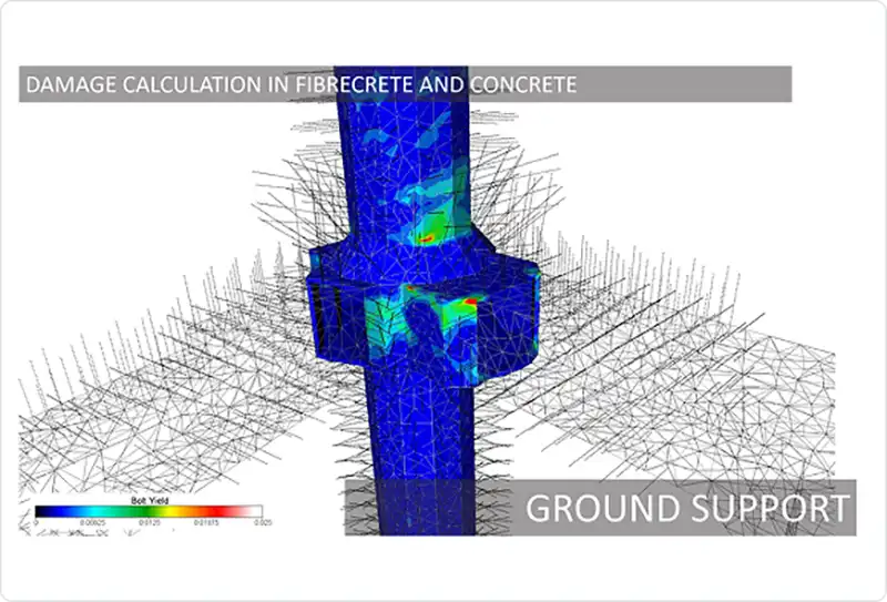 Beck Engineering provides advanced 3D finite element modelling (FEM) to support shaft sinking, shaft chamber development and manage their stability throughout excavation and operation. Our models simulate how the rock mass and support systems respond to excavation and over the life of mine, enabling safer, more efficient designs and long-term performance planning.
