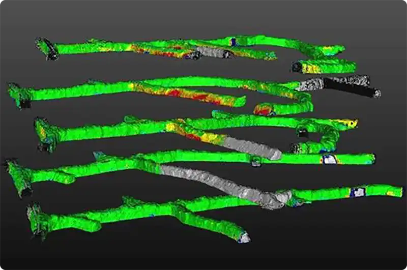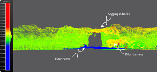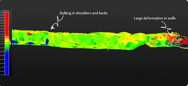 Example image of deformation mapping data from an example mine showing bulking in shoulders and backs (left) and large deformation in walls of a drive (right)